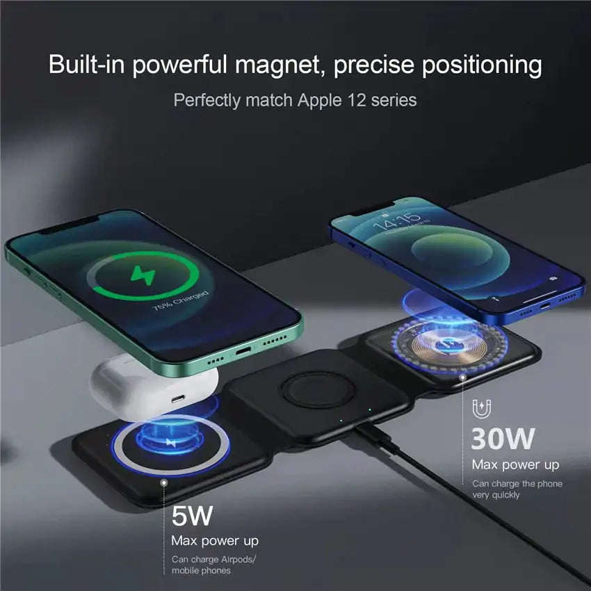 Keep your devices charged and within reach with the 3-in-1 Magnetic Wireless Charging Pad. This sleek and compact stand charges your iPhone, AirPods, and iWatch all at once-- quickly and easily. With its sleek design and magnetic base, the Wireless Charger Stand Pad is the perfect addition to any nightstand, end table, or desk.